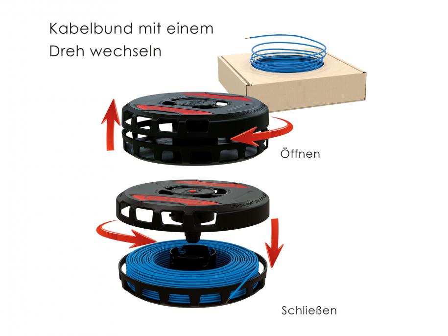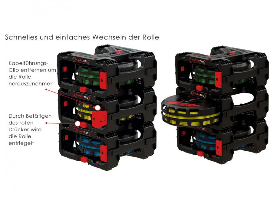 Schnelles und einfaches Wechseln: Die Rollen lassen sich über den Druckknopf mühelos wechseln. Mit einem Drehverschluss lässt sich die Rolle schnell öffnen und schließen, was den Wechsel des Kabelbundes erheblich vereinfacht.