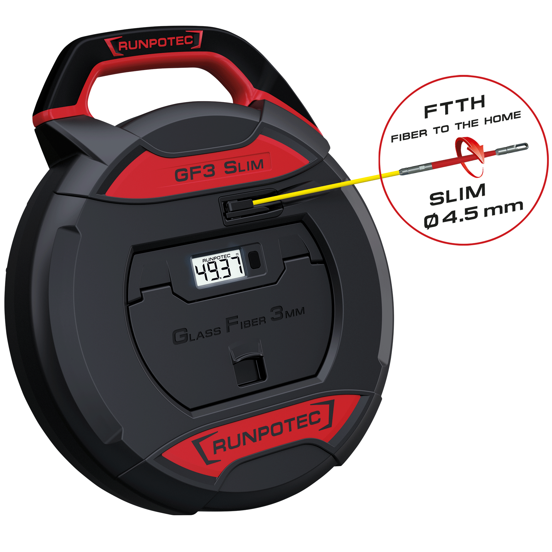 Le GF3 SLIM (FTTH) - tige de fibre optique Ø 3 mm est un appareil de tirage de câbles, y compris un compteur numérique (pour la détermination de la longueur des tubes/câbles ou l'établissement de listes de câbles). Avec un diamètre maximal de seulement Ø 4,5 mm, elle est parfaitement adaptée au recâblage de tubes occupés ou à la pose de câbles à fibres optiques (FTTH - Fiber To The Home). La tige en fibre de verre Ø 3 mm avec pointe de guidage RG4.5 brevetée, y compris la compensation de torsion, est rangée dans une boîte en plastique extrêmement résistante aux chocs. L'unité de mesure du mètre peut passer du système métrique (m) au système impérial (ft). Grâce à la nouvelle pointe de guidage RG4.5 avec filetage frontal RTG Ø 3 mm, y compris la compensation de torsion, il est possible de surmonter des rayons de courbure jusqu'à R = 40 mm. La sécurité automatique contre le recul empêche la tige en fibre de verre de glisser involontairement dans la boîte. La boîte s'ouvre avec une seule vis à l'arrière pour les travaux de maintenance. Cela permet également de retirer la boîte d'accessoires intégrée, qui contient un jeu de 14 accessoires. Le filetage d'adaptation inclus avec un filetage intérieur RTG Ø 3 mm sur un filetage extérieur RTG Ø 6 mm permet de nombreuses possibilités de combinaison. En outre, la boîte dispose d'une poignée de transport ergonomique et d'un revêtement antidérapant à l'arrière. La charge de rupture totale de 100 kg se rapporte à la tige en fibre de verre Ø 3 mm, y compris la pointe de guidage RG4.5 avec compensation de torsion. Domaine d'utilisation optimal : pour les tubes de Ø 5 mm à 40 mm de diamètre intérieur.