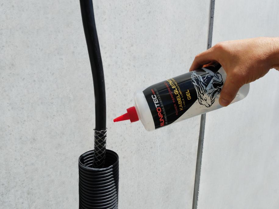 Champ d’application : Le lubrifiant pour câble RUNPOTEC Gel réduit fortement la résistance au frottement, facilitant ainsi l'insertion des câbles et des fils dans les conduits d'installation électrique et protégeant contre les dommages aux câbles. Application : Appliquer le lubrifiant pour câble RUNPOTEC Gel sur le câble ou dans le conduit. Également très efficace lors de l’introduction de systèmes d'insertion de câbles. Caractéristiques du produit : Ininflammable, réduit la résistance au frottement, résistant à la température jusqu'à 85°C, effet de glissement amélioré, sans silicone, soluble dans l'eau, non corrosif, ne colle pas, compatible avec la peau, biodégradable. Se dissout sans laisser de résidu. Attention : Fermer après utilisation, stocker dans un endroit frais et sec. Le lubrifiant pour câble ne doit pas entrer en contact avec des pièces sous tension = risque de court-circuit ! EUH208 : Contient du 2-méthyl-2H-isothiazol-3-one. Il peut provoquer des réactions allergiques. Possibilité de taches sur les surfaces sensibles. Pour les remarques, cf. fiche de données de sécurité ! Fournitures : 1 lubrifiant pour câbles Gel