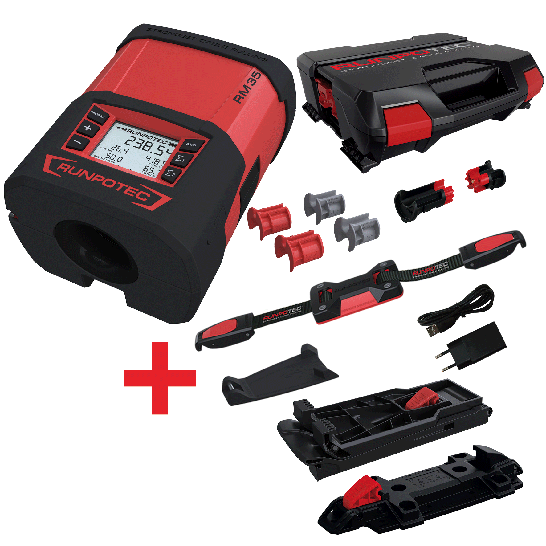 1 x RM35, 1 x Gurt mit Clipsystem 1200 mm, 1 x Ankerpad,1 x Montageplatte-Systemkoffer, 2 x Führungsbacken grau (Ø 12 mm / 18 mm), 2 x Führungsbacken rot (Ø 6 mm / 24 mm), 1 x USB-C Ladekabel, 1 x EURO-Netzstecker, 1 x RUNPOTEC Systemkoffer