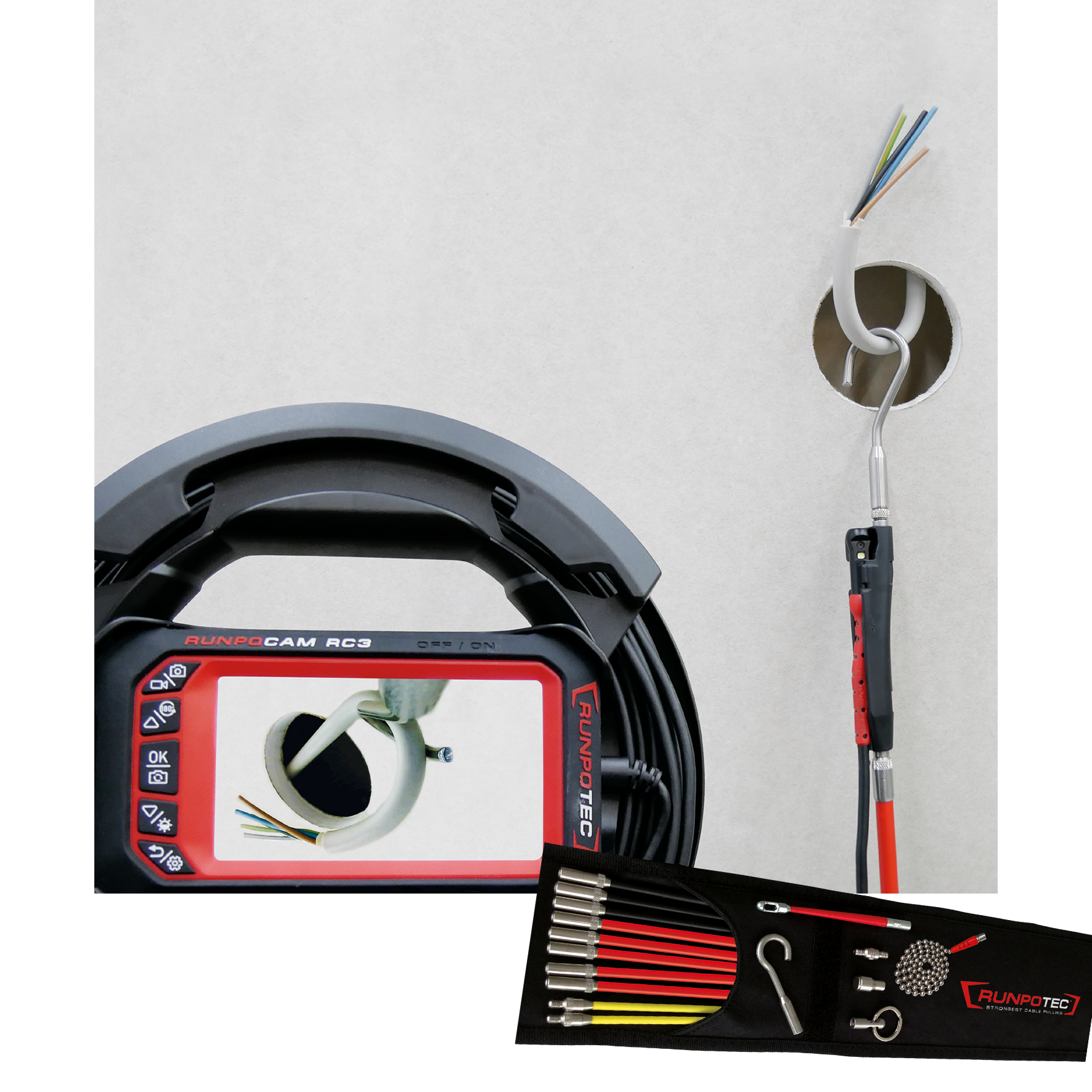Die neue Basalttechnologie ermöglicht extreme Biegeradien bei gleichzeitig hoher Formstabilität der Stäbe. Alle Verbindungen sind mit einem RTG Ø 6 mm Gewinde ausgestattet und kommen ohne Stosskanten oder Gewindeübergänge aus, was ein sauberes und reibungsfreies Arbeiten erlaubt. Die Stäbe sind kunststoffummantelt, wodurch kein Eindringen von Fasern in die Haut möglich ist. Der extra starke Magnet hält Gegenstände bis zu 2,5 kg zuverlässig fest und kann in Kombination mit der Kugelkette ideal zum gezielten Orten sowie zum Führen durch Wand- und Maueröffnungen eingesetzt werden. Der enthaltene Spezial-Gleithaken überwindet dank seiner Kippfunktion Hindernisse bis zu 6,5 cm Höhe problemlos. Für optimale Sicht sorgt die stossfeste LED-Lampe mit hoher Leuchtkraft und langer Betriebsdauer durch eine AAA-Duracell-Batterie. In der praktischen Aufbewahrungstasche mit Tragegurt lässt sich das gesamte Zubehör kompakt und sicher verstauen. Optimales Einsatzgebiet: abgehängte Decken, Kabelkanäle, Hohlwände, Nachverkabelung bei nicht geführten Leitungen, Unterflurschächte, diverse Durchführungen und vieles mehr.