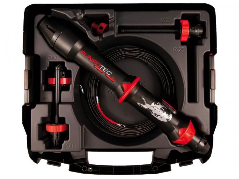 1 x RT 2008 Basisgerät, 1 x Steckaufsatz Ø 20 mm, 1 x Steckaufsatz Ø 25 mm, 1 x Steckaufsatz Ø 32 mm, 1 x Steckaufsatz Ø 40 mm, 1 x Steckaufsatz Dose flexibel, 2 x Steckkupplung, 1 x Gürtelclip, 1 x RUNPOGLEITER Spirale MET 15 m, 1 x RUNPOTEC Systemkoffer