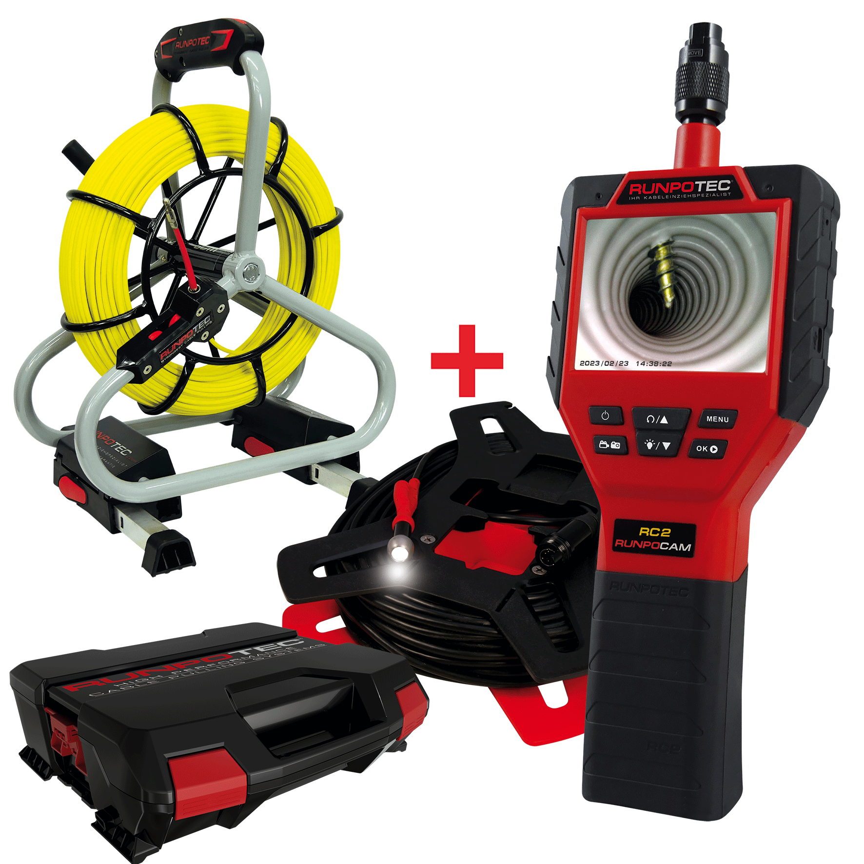 Fournitures : RUNPOCAM RC2 avec câble, bobine incluse, dans une mallette modulaire et accessoires inclus : RUNPOGLIDER avec filetage frontal, Systemglider, lampe haute puissance à accu LED 320 lumens, Micro Memory Card 8 Go, kit de préhension magnétique, embout fileté RTG Ø 6 mm, crochet de préhension, double fiche de charge USB C6 12 V, embout pliable 12 cm, câble USB 3 m, double fiche de charge USB 230 V, embout fileté RC 2, câble de charge USB pour lampe à accu LED + Kit Pro 1 tige en fibre de verre Ø 4,5 mm de 50 mètres incl. RUNPOGLIDER au niveau de l’aiguille et douille terminale en fin de tige, pieds d’appui extractibles et coffre de rangement + accessoires supplémentaires : 2 x douilles terminales, 1 x douille de liaison, 1 x manille, 1 x colle spéciale, 1 x roue de glissement "