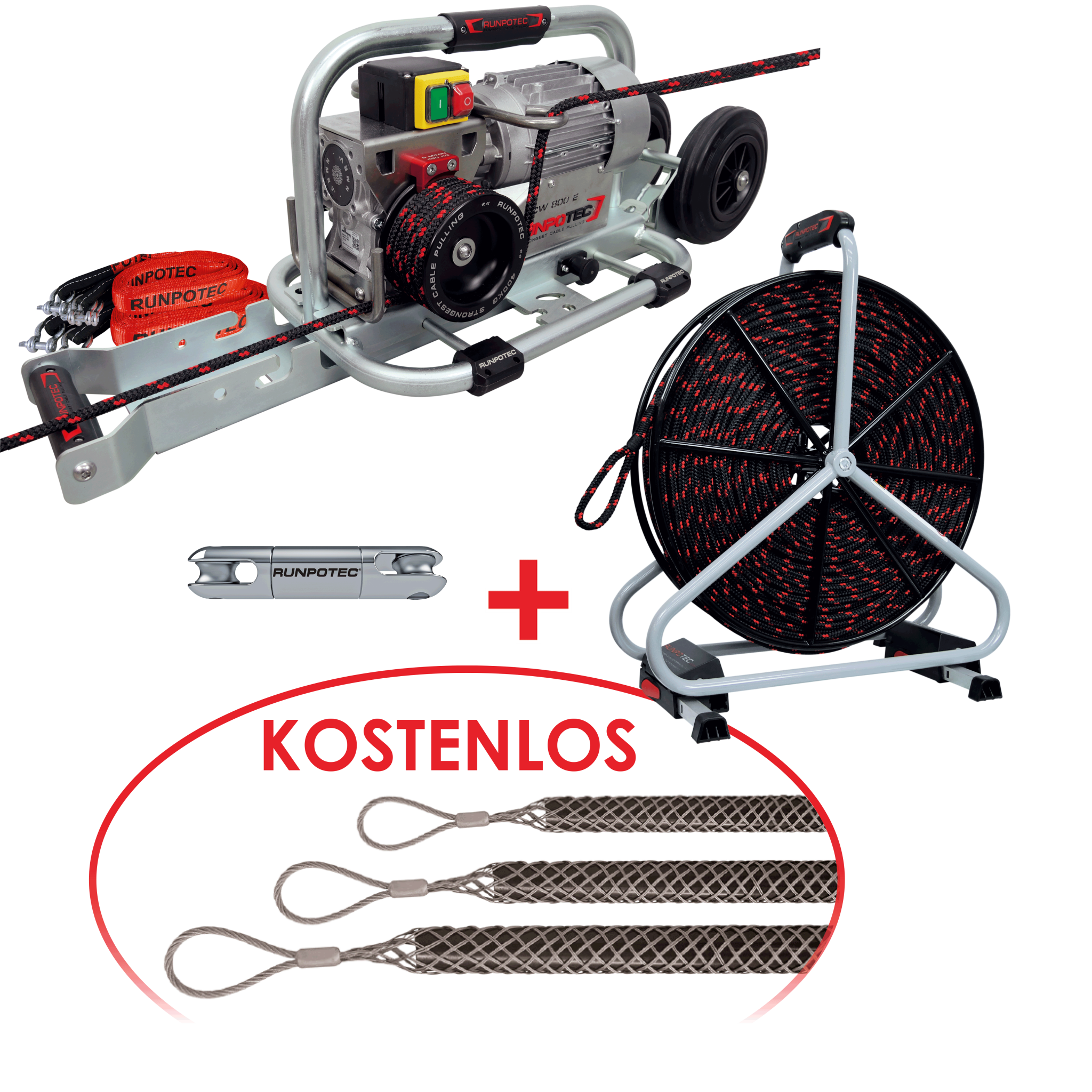 1 x CW 800 E - Treuil à cabestan, y compris rail de montage trolley, 1 x sangle de 3 m, 1 x câble de traction en polyester Ø 10 mm, longueur 200 m, y compris dévidoir Ø 770 mm avec frein de blocage et roues de transport, + 1 x émerillon de liaison avec compensation de torsion, + 1 x tire-câble à boucle CW Ø 25 - 30 mm, + 1 x tire-câble à boucle CW Ø 30 - 40 mm, + 1 x tire-câble à boucle CW x Ø 40 - 50 mm